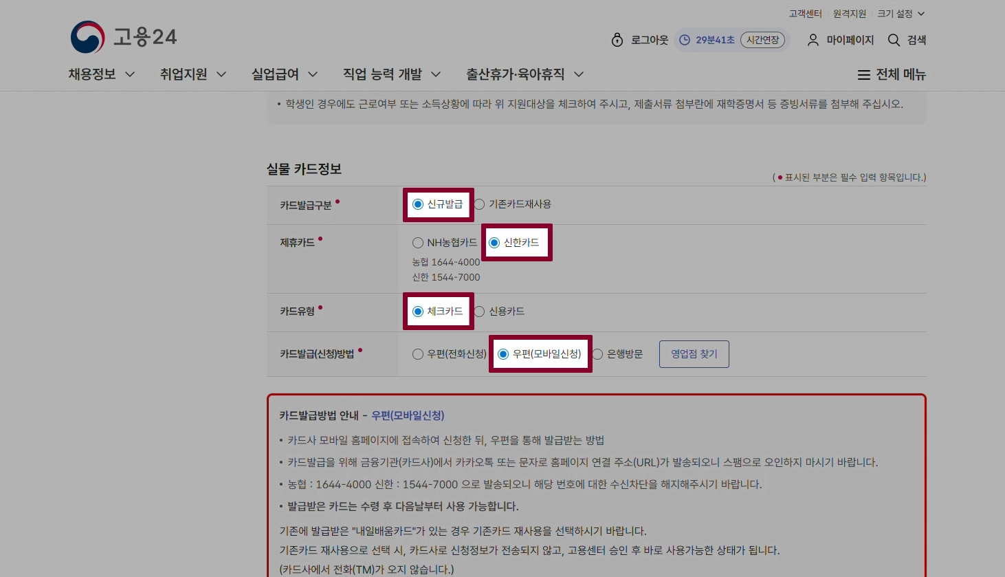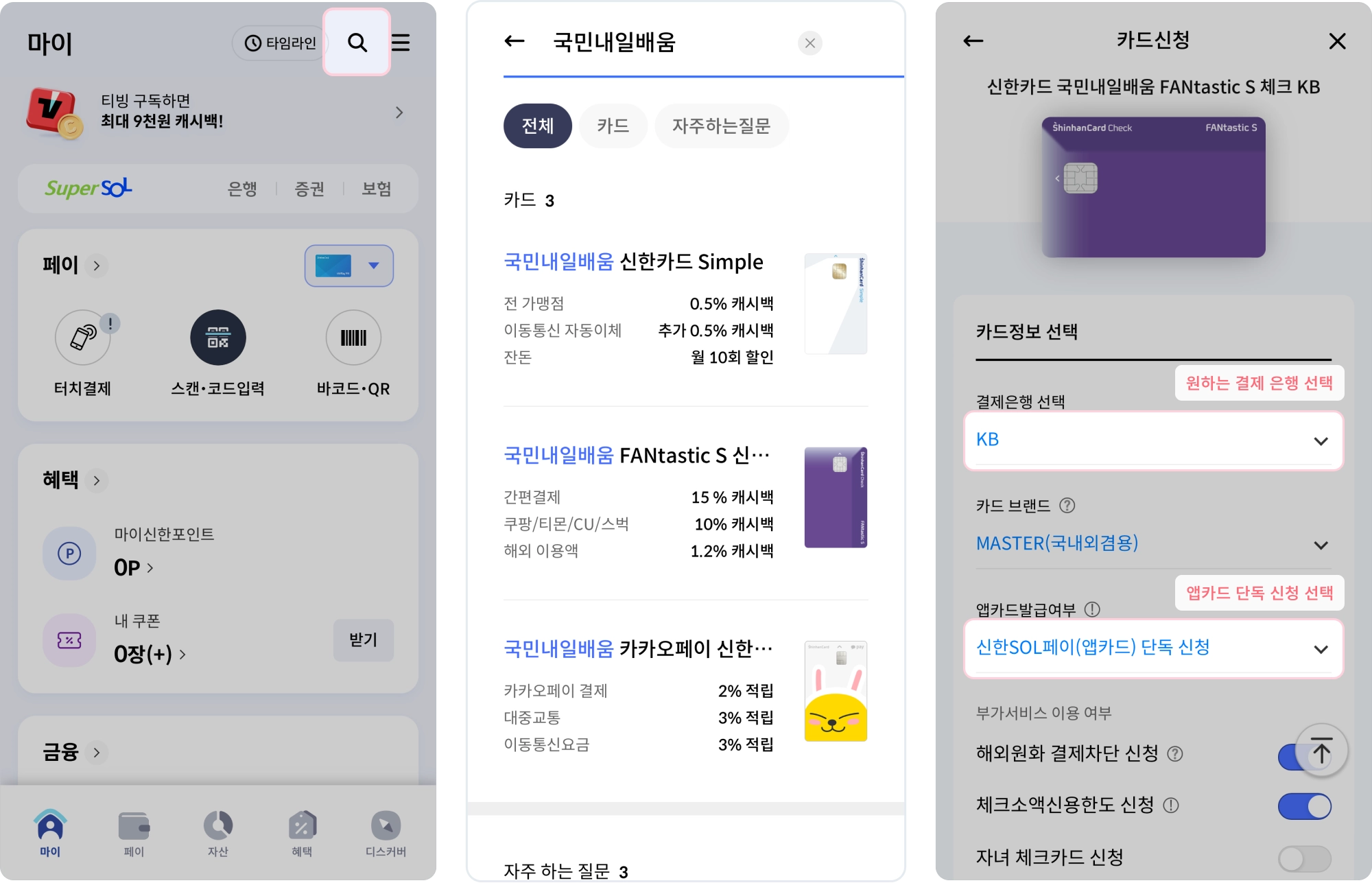 3-3. 카드 형태는 신규 발급 → 신한카드 / 체크카드 → 우편(모바일신청)=앱 카드 으로 선택해 주세요.