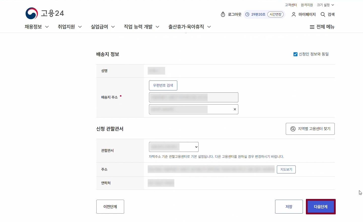 3-5. 카드 배송지 입력 및 관할관서를 확인하신 뒤 다음 단계를 클릭해 주세요.