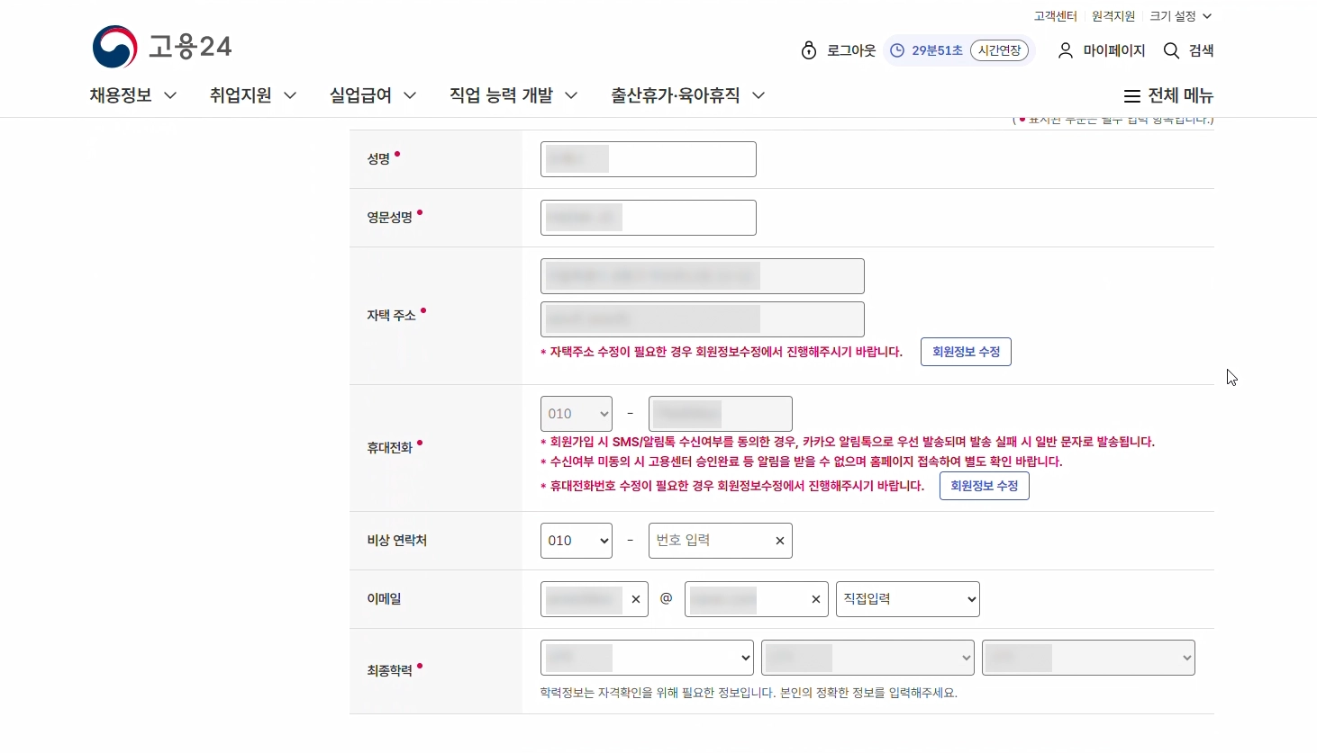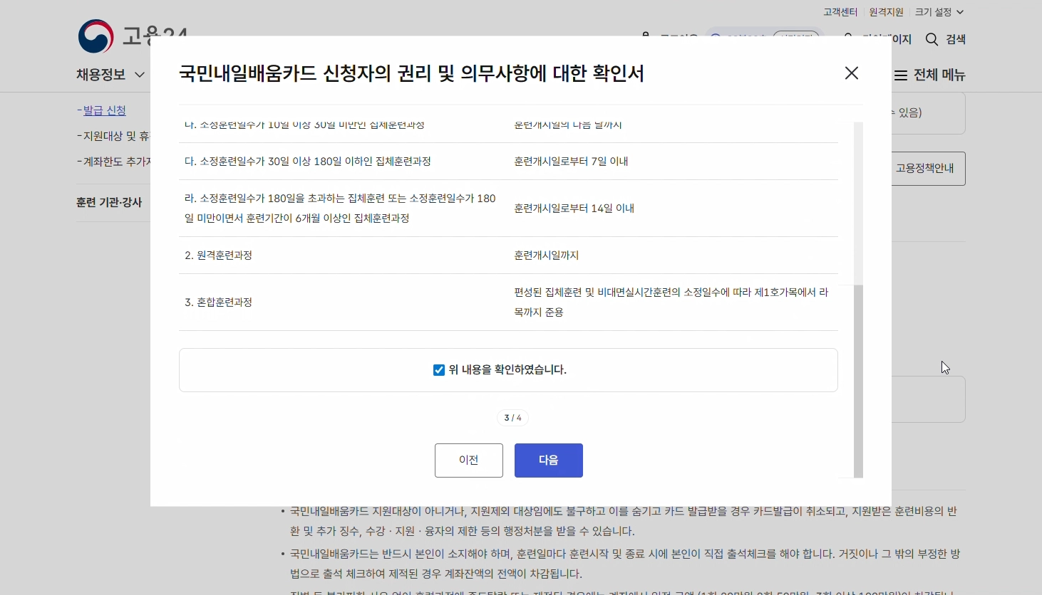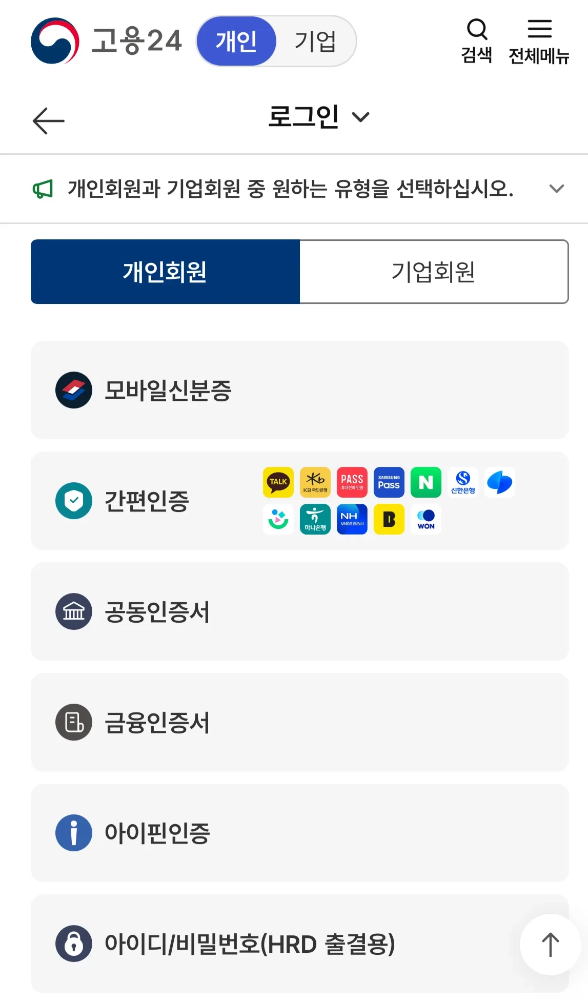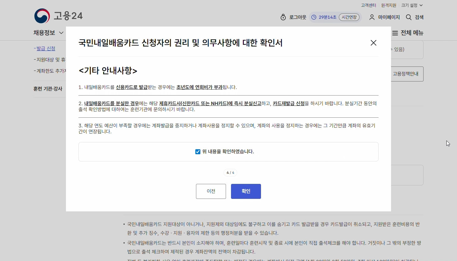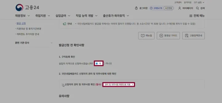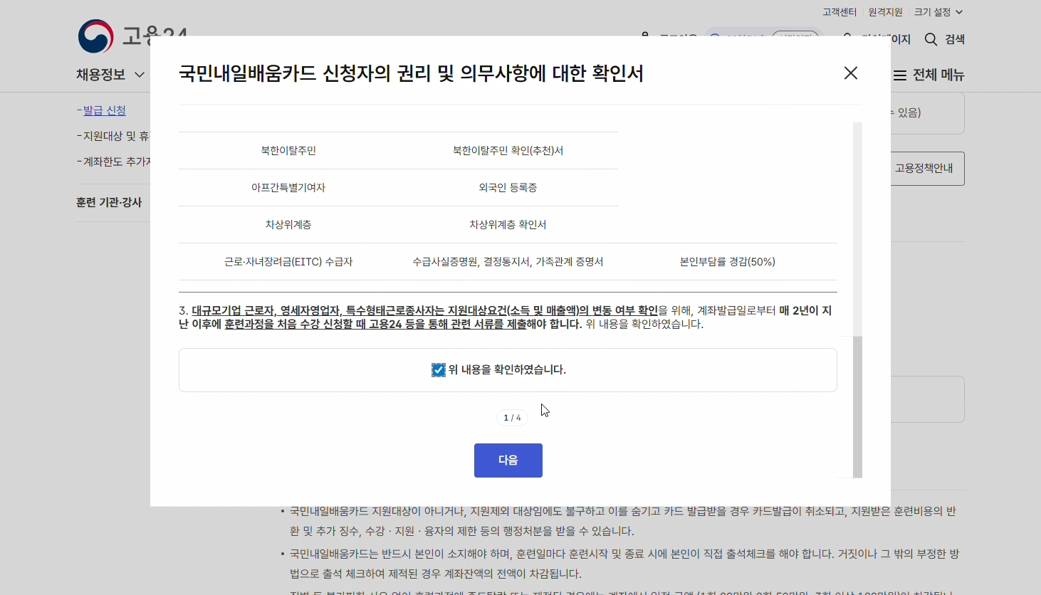 앱을 통해 등록한 카드가 고용24 전산에도 잘 반영되었는지 확인하는 과정입니다.