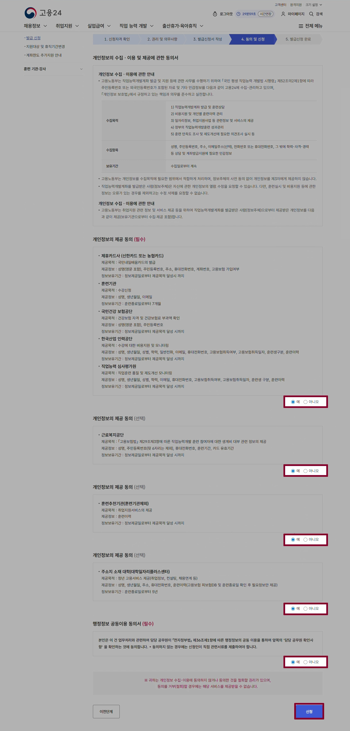 4-1. 개인정보 제공 동의 및 행정정보 공동이용 동의서에 대한 항목을 확인하시면서 체크 후 최종적으로 신청 버튼을 클릭해 주세요.