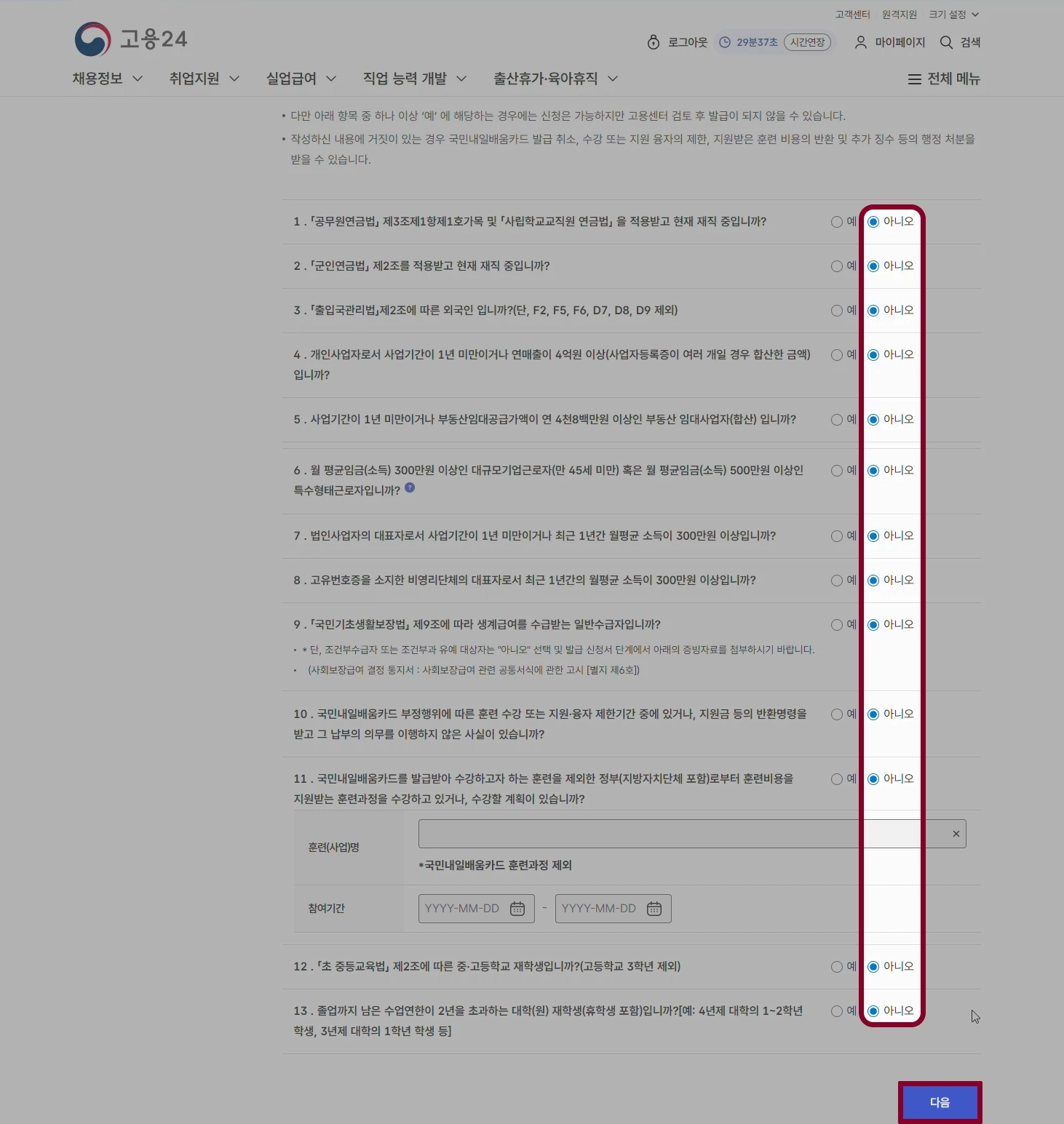 잠깐! ‘예/아니오’ 체크 상황에 따라 내일배움카드의 형태가 달라져요.