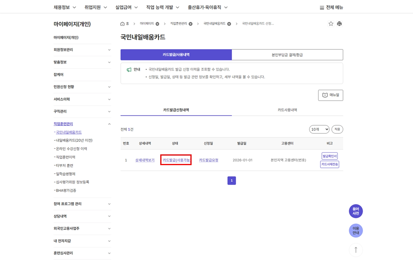 고용24 → 마이페이지 → 직업훈련관리 → 국민내일배움카드 → 카드발급/사용내역 순서로 클릭하여 카드의 상태가 ‘카드발급(사용가능)’ 상태인지 확인해 주세요.