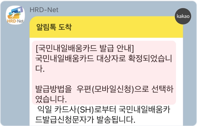 내일배움카드 신청 후 대상자 확정 안내 알림톡을 받으셨다면 카드 신청 문자를 기다려 주세요!