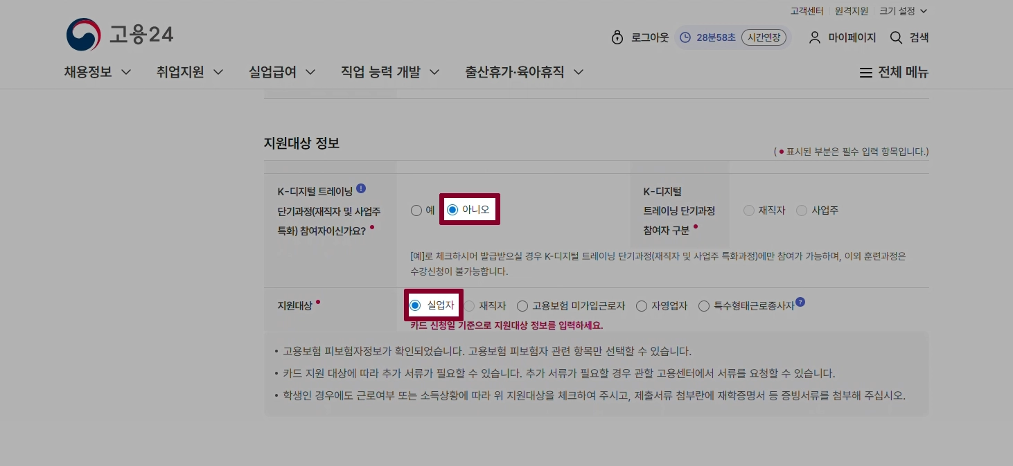 (현재 재직자일 경우에도 퇴사 예정이라는 가정 하에 실업자 자격으로 체크해 주세요. )